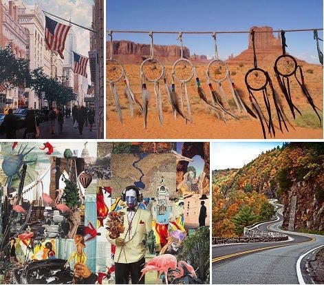 Clockwise upper left are "Gotham Today", oil by William Dodge; "American Moments", digital photograph by Greg Dorata; "Solitude", digital photograph by Kara Reyes; "For Your Eyes Only", multimedia by Eileen Zegarek