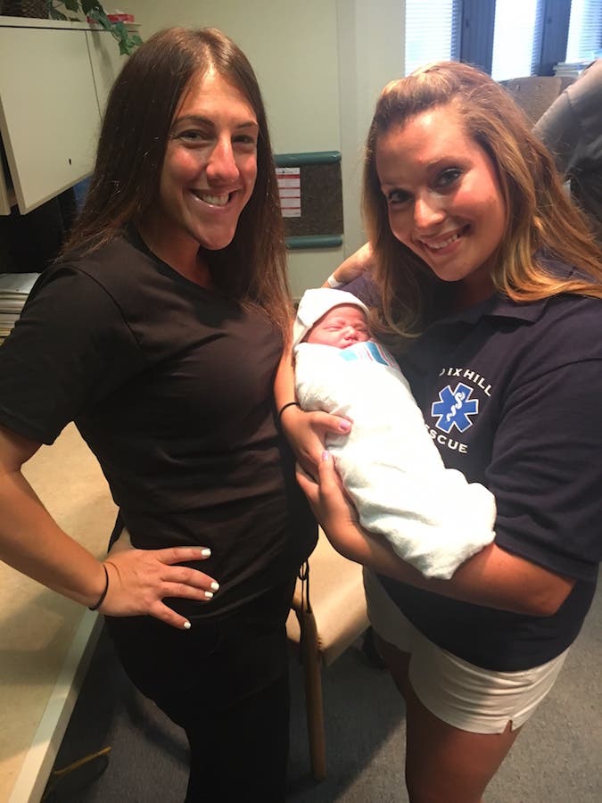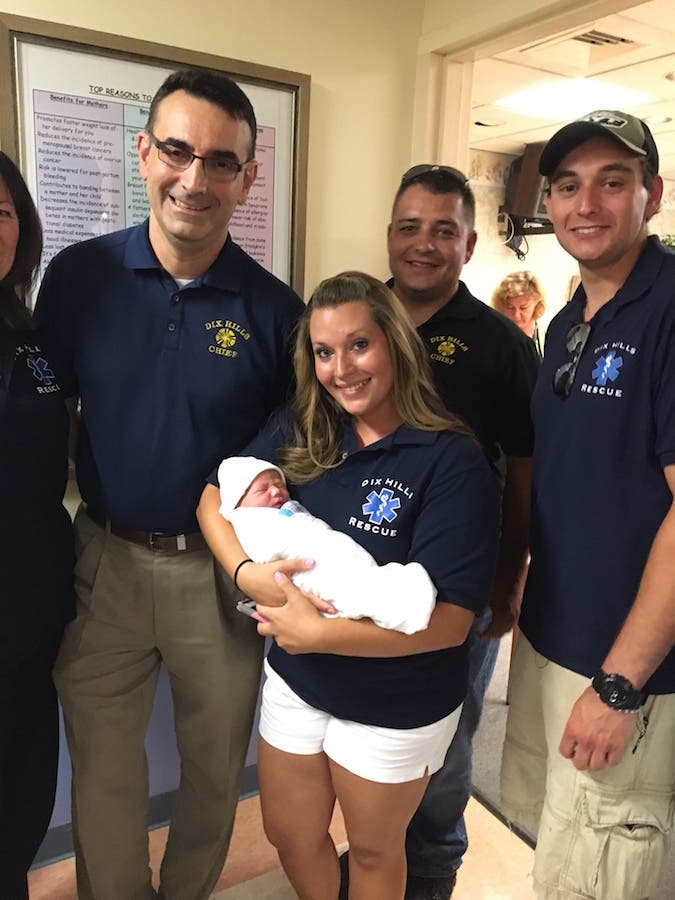 Dix Hills Rescue Squad Lieutenant EMT Meagan Pereira helped deliver the baby and cut the umbilical cord while paramedic Chris Tremblay suctioned the baby boy when he was born to determine he was in good condition.