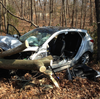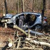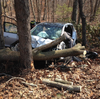 The vehicle went off the road and slammed into a tree, shearing it off. The driver was trapped in the wreckage and firefighters used chainsaws to cut trees to rescue him, according to fire officials.