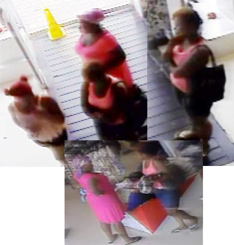 The woman who stole the clothing had short hair, was wearing a pink tank top, shorts, flip flops and was holding a black bag.