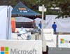 Workers were busy Thursday setting up the stage for a musical performance heralding the opening of the Microsoft store at Walt Whitman Shops.