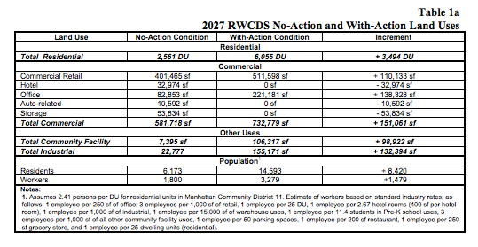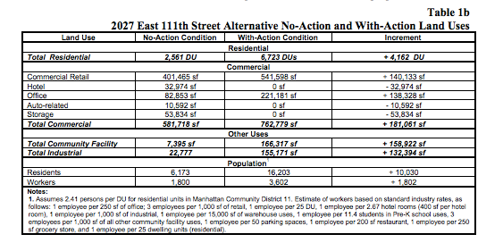 The first scenario estimates that 3,494 apartment units will be added to East Harlem as a product of the rezoning plan. The plan would also add more than 150,000 square feet of commercial space and more than 130,000 square feet of industrial space, according to the draft scope of work.