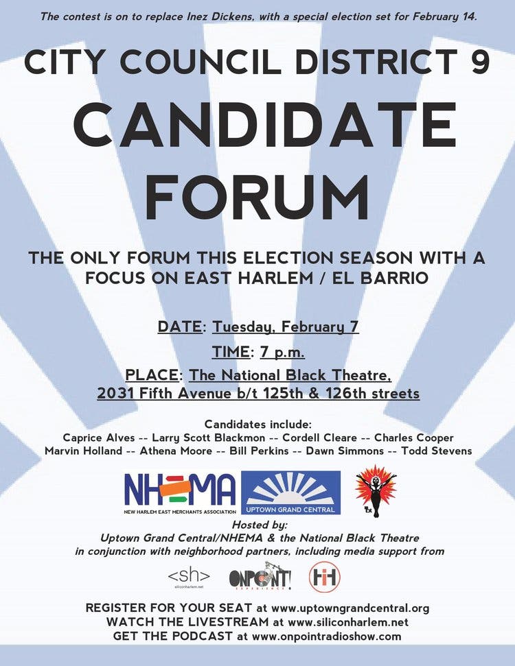 EAST HARLEM, NY — Candidates vying for the vacant City Council District 9 seat in a February 14 election will debate issues facing East Harlem on Tuesday, Feb. 7.