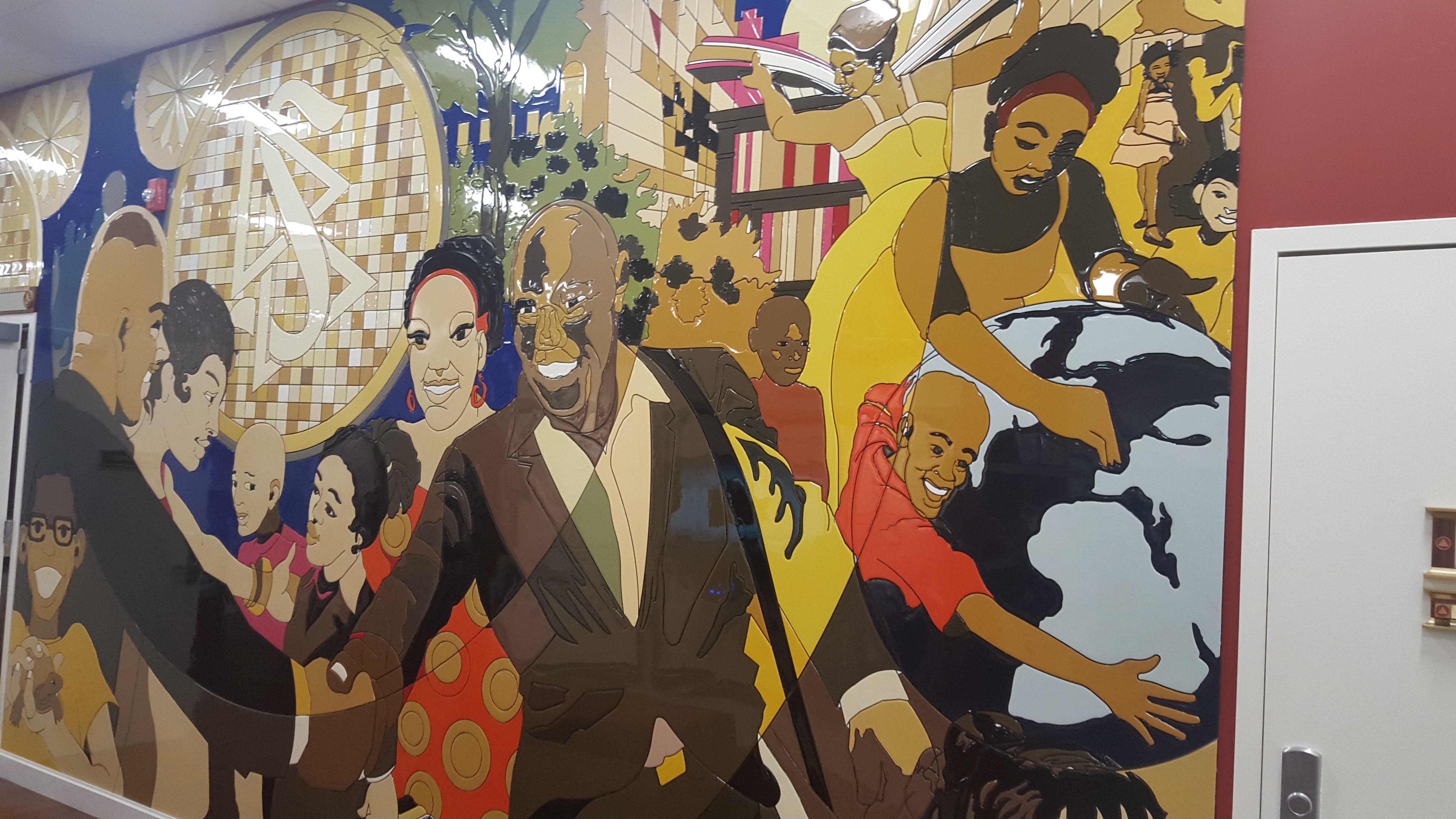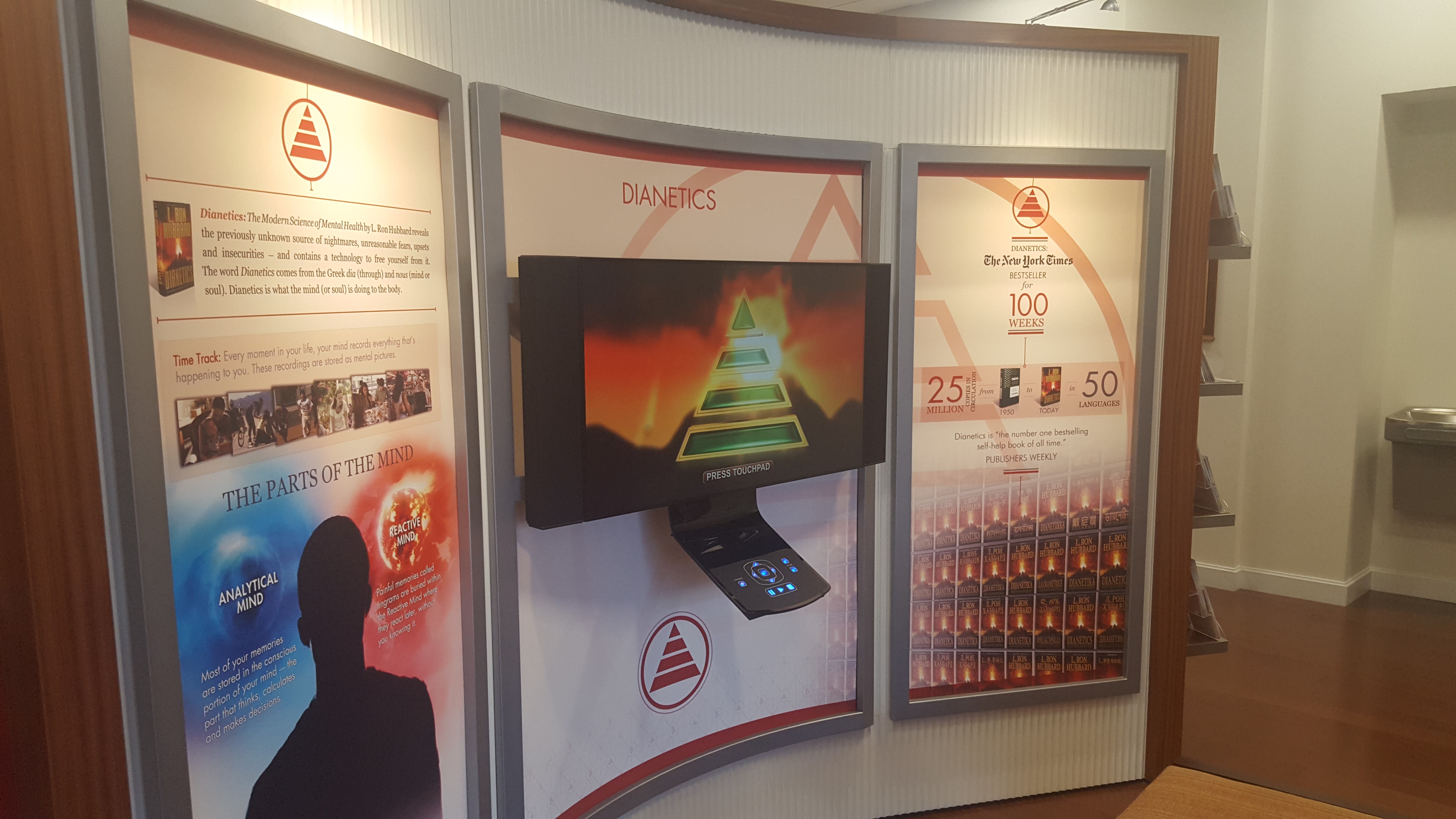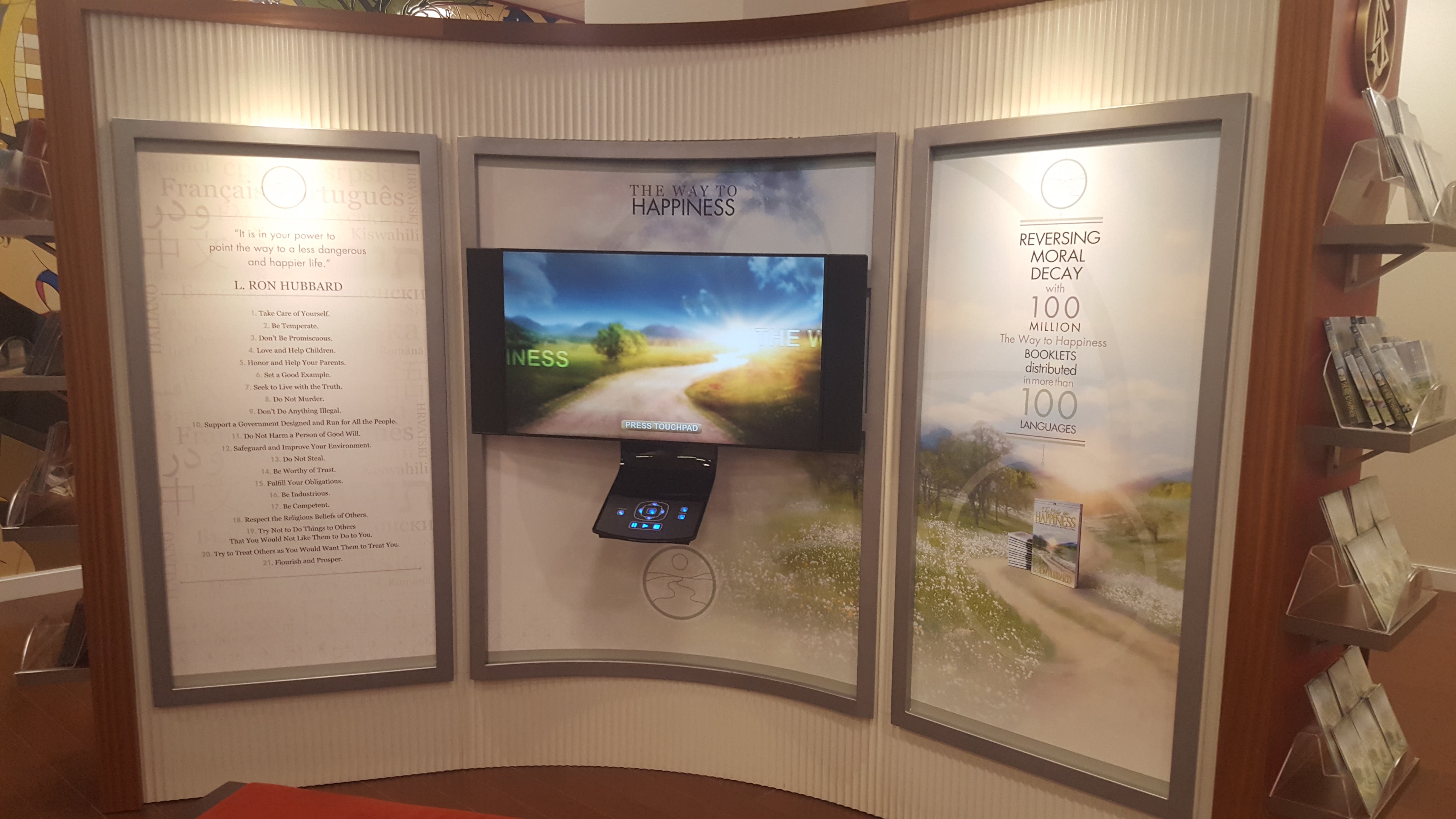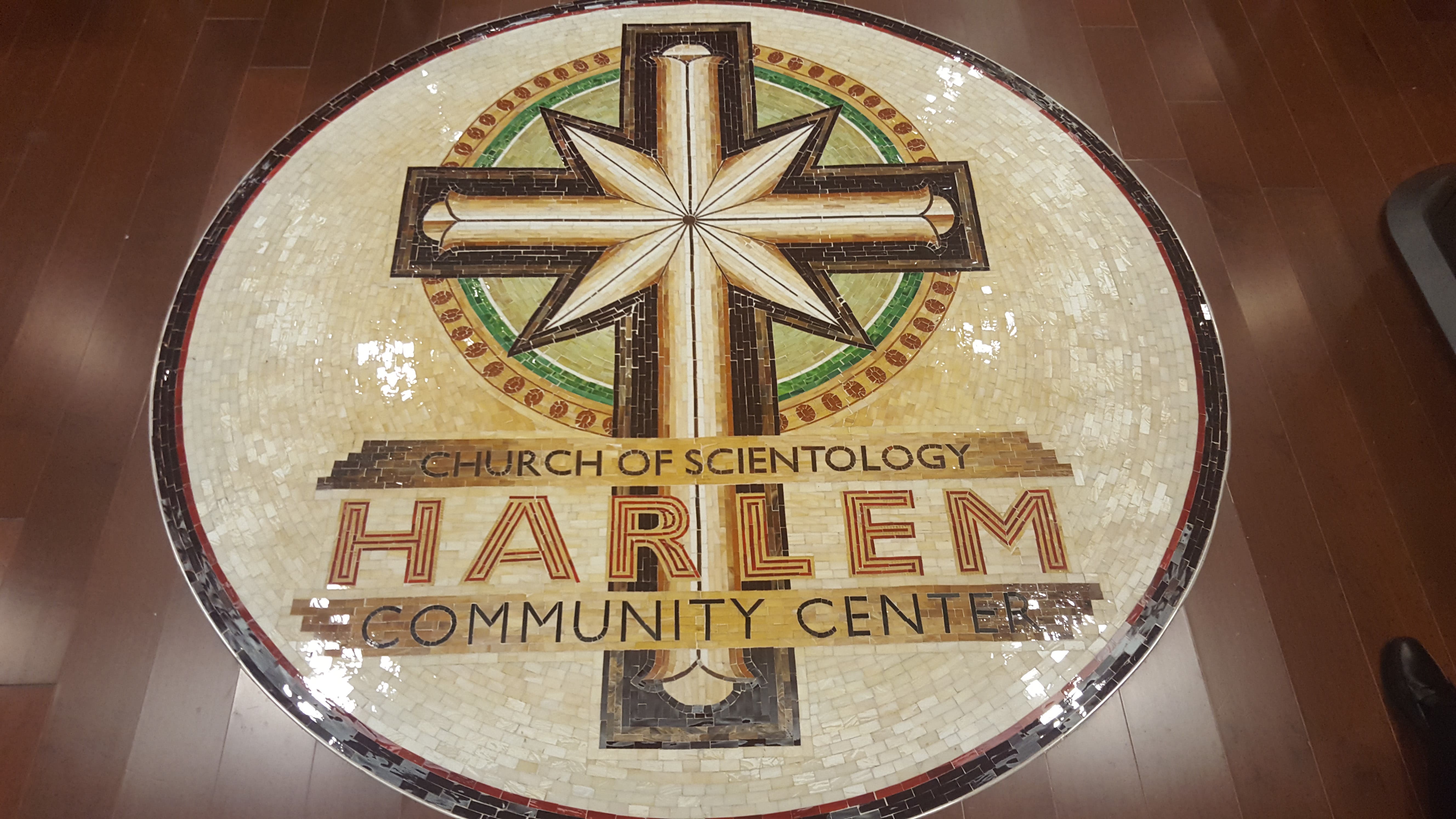 The first thing you see when walking into the Scientology community center in Harlem are screens hooked up to futuristic looking touch pads. These panels are a resource for people interested in Scientology to learn more about the religion and programs such as "Dianetics" and the popular "The Way to Happiness." A huge mural lines the back wall of this room consisting of several digitally-created pieces assembled together. The interior decoration budget for this place certainly wasn't cheap.