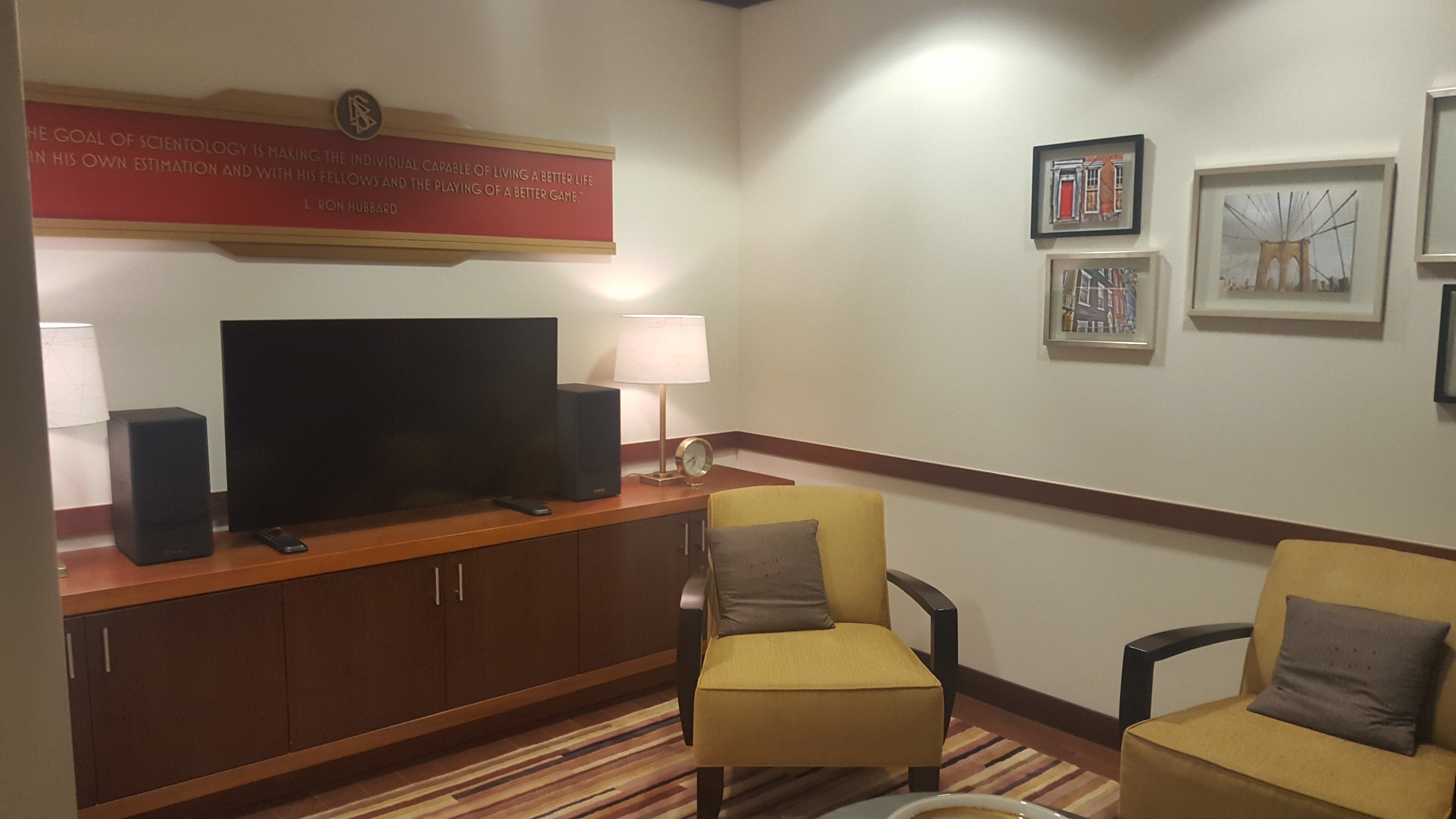 Throughout the entire complex the works of Hubbard were on full display. Also littered throughout the building were film rooms, or "enlightenment areas," where people can view the church's educational programming as they wait for an event or meeting.
