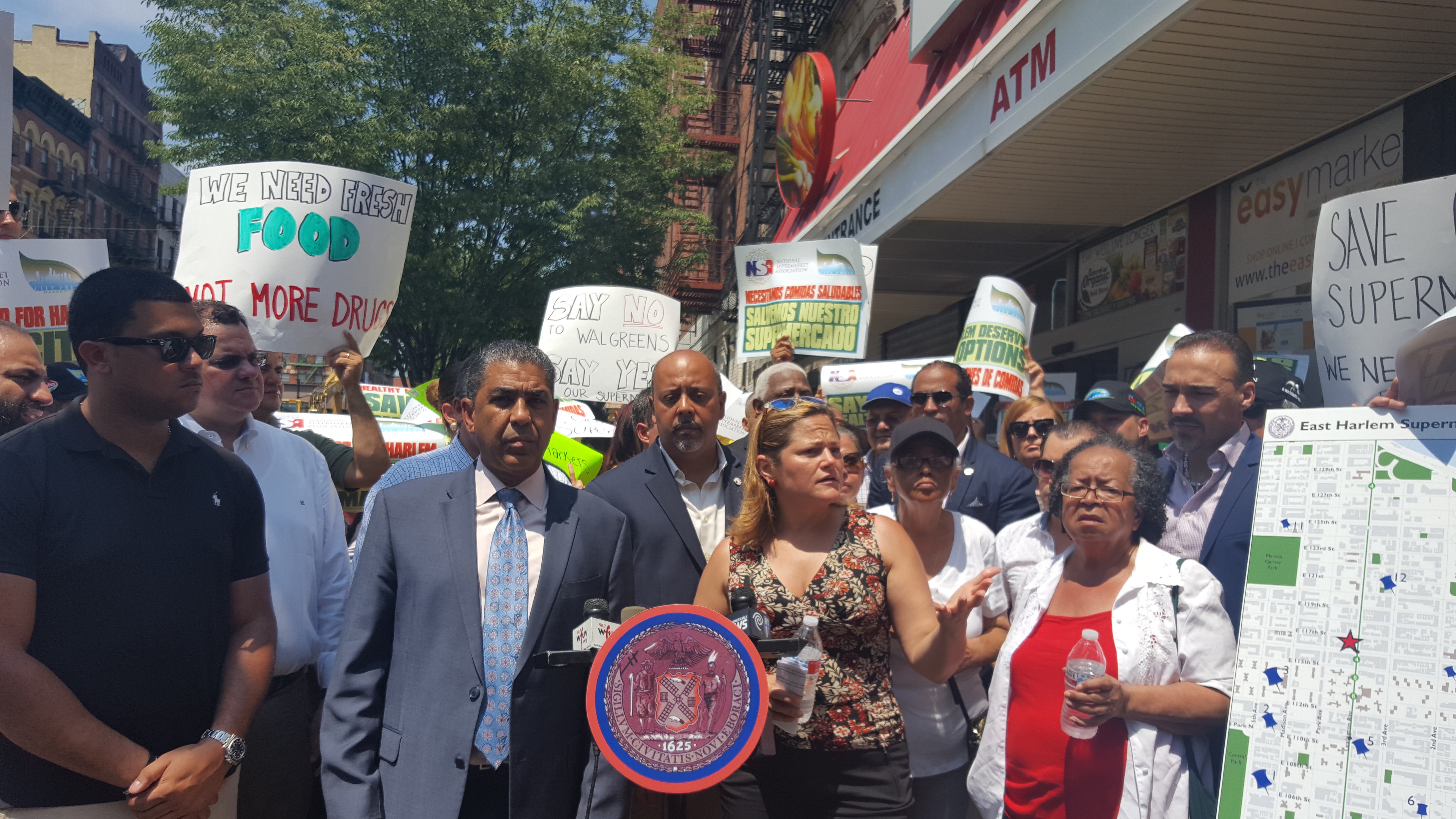 The rally was organized by the National Supermarket Association to protest the imminent shuttering of City Fresh Market and was supported by elected officials such as the Democratic nominee for Congress Adriano Espaillat and City Council Speaker Melissa Mark-Viverito.