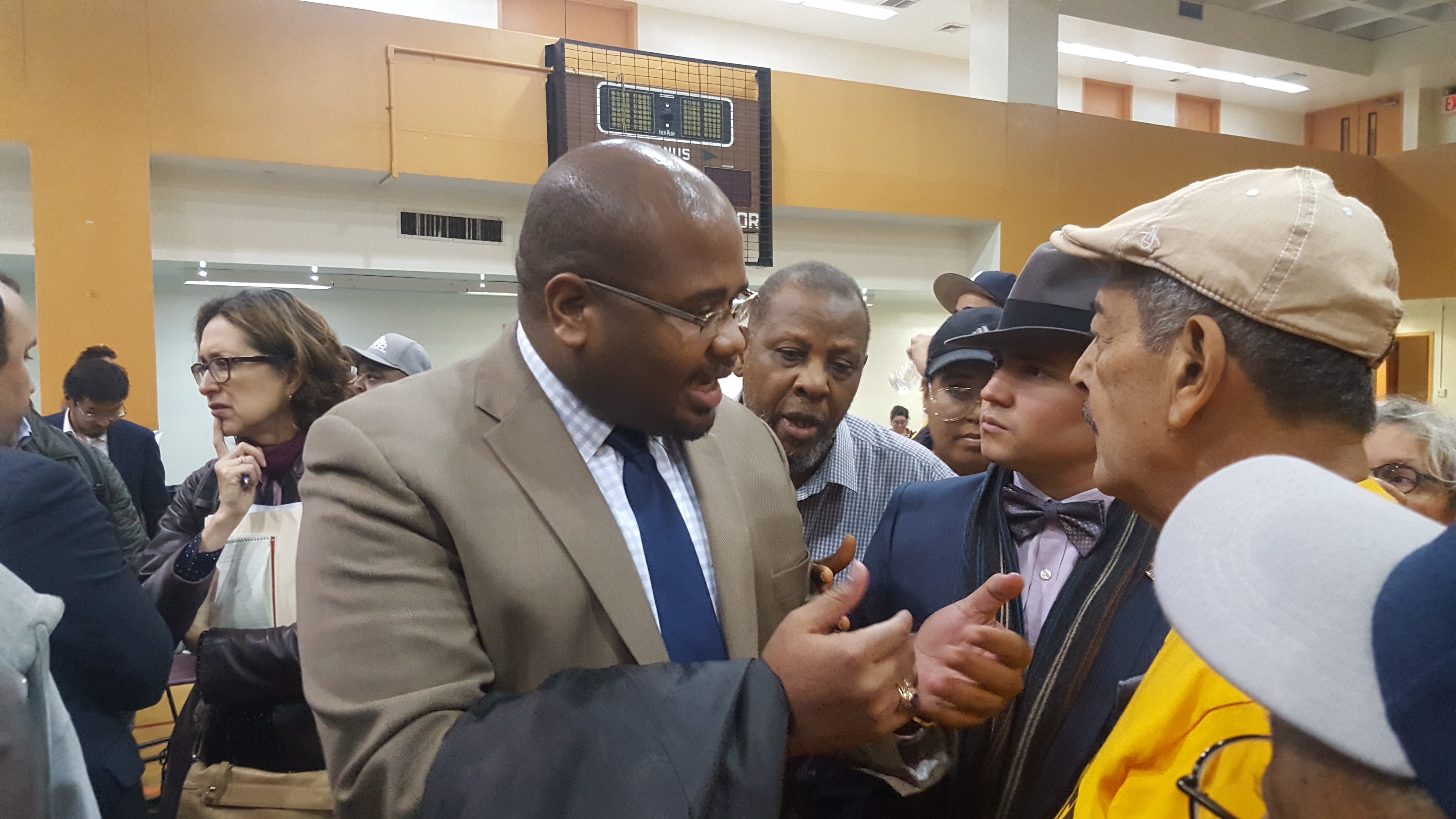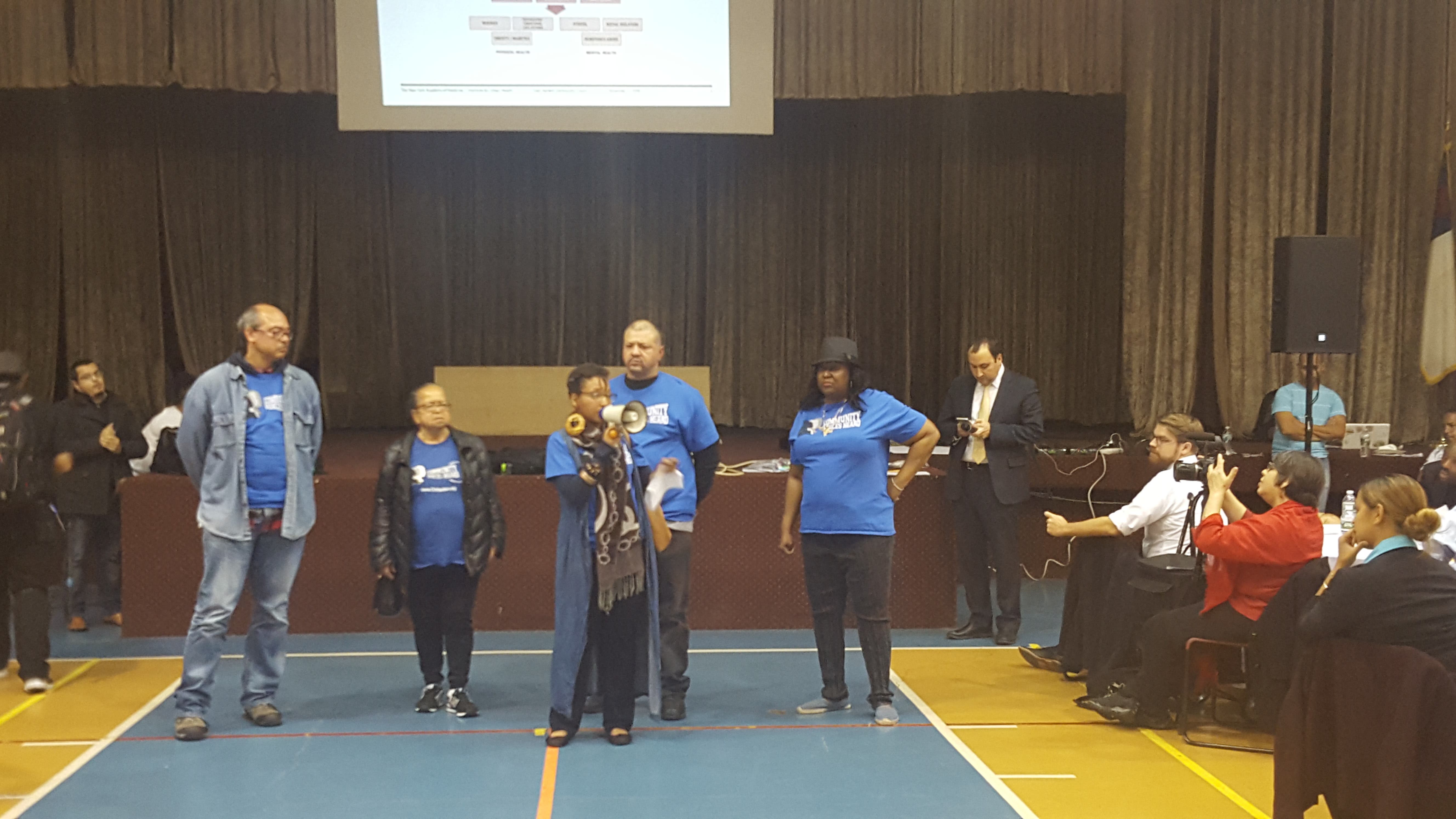 As members of Community Voices Heard stormed out of the meeting, members of El Barrio Unite began to gather near the stage and demand a chance to be heard. Protesters spoke with representatives of local elected officials and eventually were seated on the gymnasium floor.
