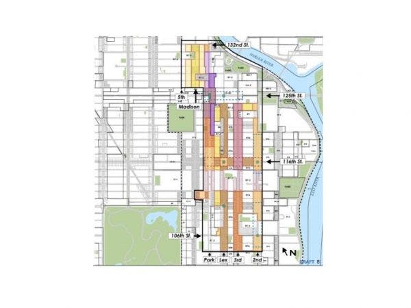 The neighborhood plan, proposed in October, calls for zoning changes in East Harlem in two parts of the neighborhood. The first part spans from East 104th Street to East 126th Street between Park and Second avenues, and the second part spans from East 126th Street to East 132nd Streets between Fifth and Second avenues.