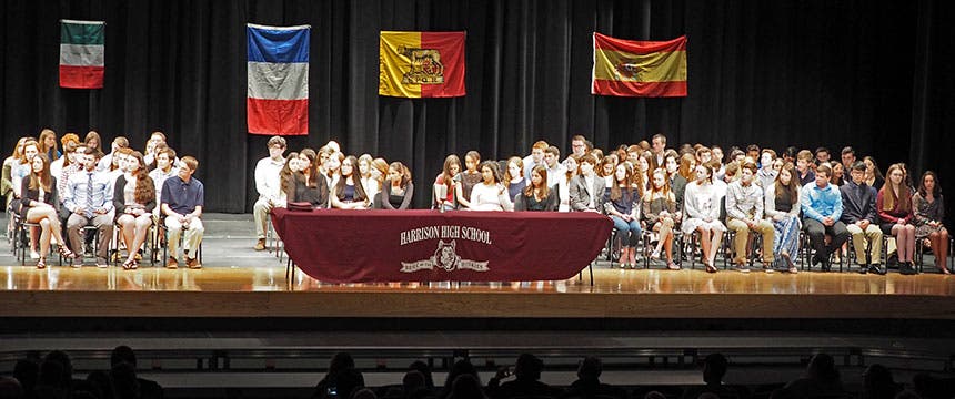 Congratulations to the 107 Harrison High School students who were inducted into the National Foreign Language Honor Society. Student speakers Miwa Goble (French), Jaclyn Ciaramella (Italian), Phoebe Streeter (Latin) and Vanessa Serna Villa (Spanish) provided reflections of their experiences immersed in their chosen languages.