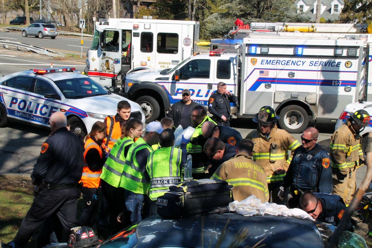 The male driver of the Pontiac was airlifted to Stony Brook University Hospital with serious, but non-life threatening injuries. An adult male passenger in the Pontiac was transported to Southside Hospital for treatment of minor injuries.
