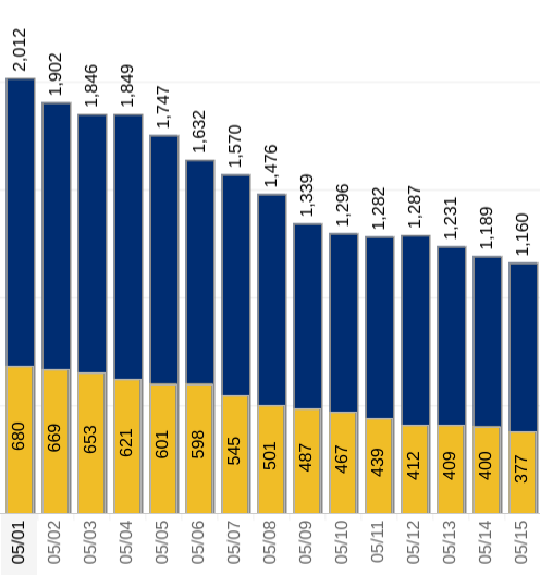 Here's what the trend in COVID-19 hospitalizations May 1-15 looked like for Long Island (the peak, on April 11, was 4,108 total hospitalizations.)
