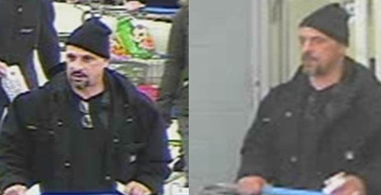 The suspect is described as a white male, approximately 40-45 years old with a goatee. He was wearing a black coat and black winter cap at the time of the theft.