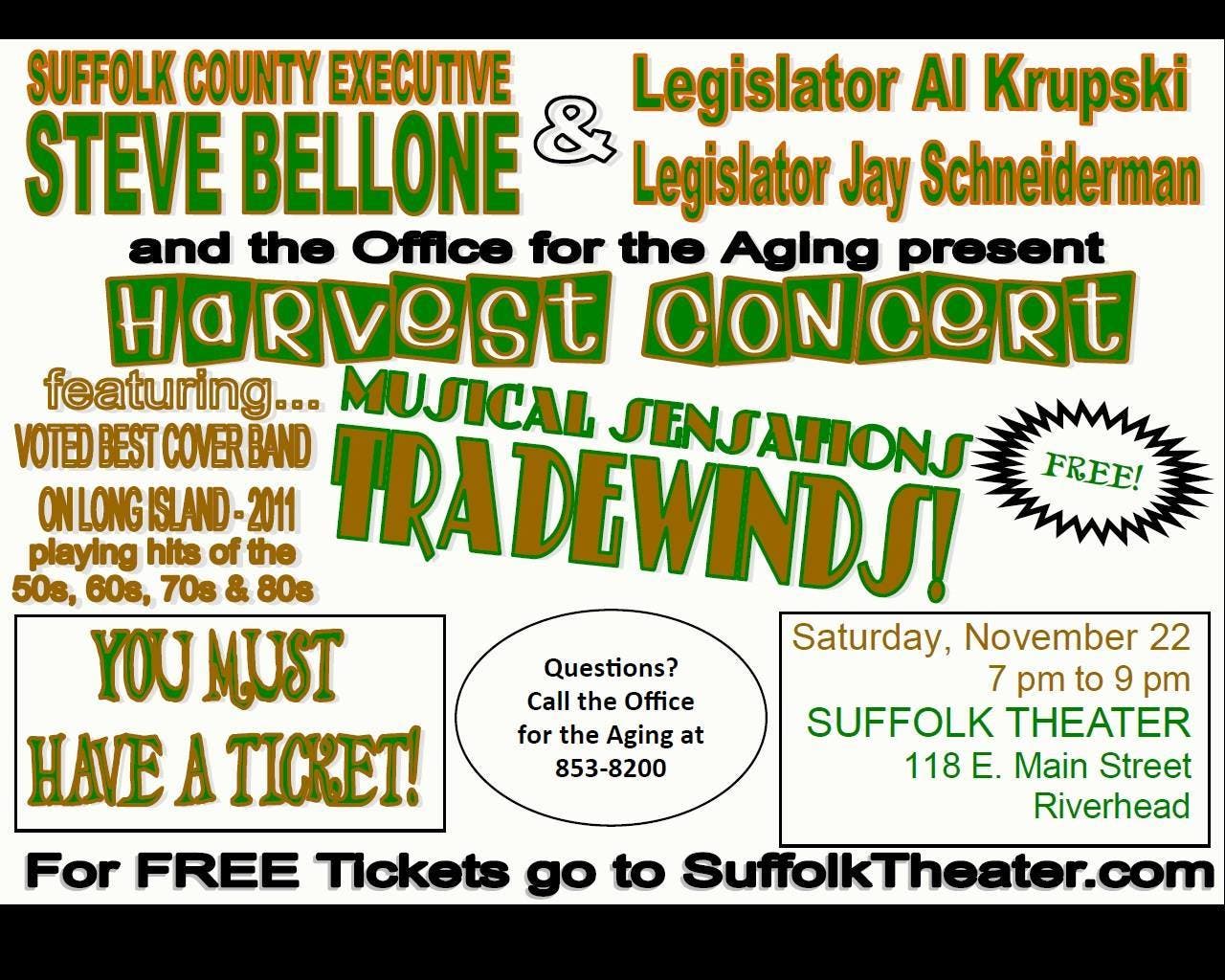 (Hauppauge, NY –November 7, 2014) The Suffolk County Office for the Aging will host a Harvest Concert on Saturday, November 22 at the Suffolk Theatre, 118 East Main St., Riverhead, NY. The concert will begin at 7:00 p.m. and will feature the regionally-acclaimed cover band, Tradewinds.