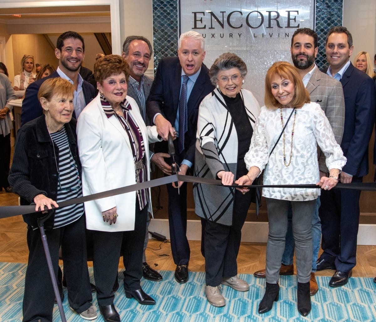 (left to right) Marilyn Benner, Arlene Katz, Lorraine Sossin and Marlene Padover, residents of Long Island’s first luxury senior rental community in Jericho, join Scott Burman, Jan Burman, Steven Krieger, David Burman and Jonathan Weiss, principals of Engel Burman, as they celebrate the grand opening of Encore Luxury Living. Encore is designed to combine the ease of apartment living with the luxurious services found at high- end hotels.