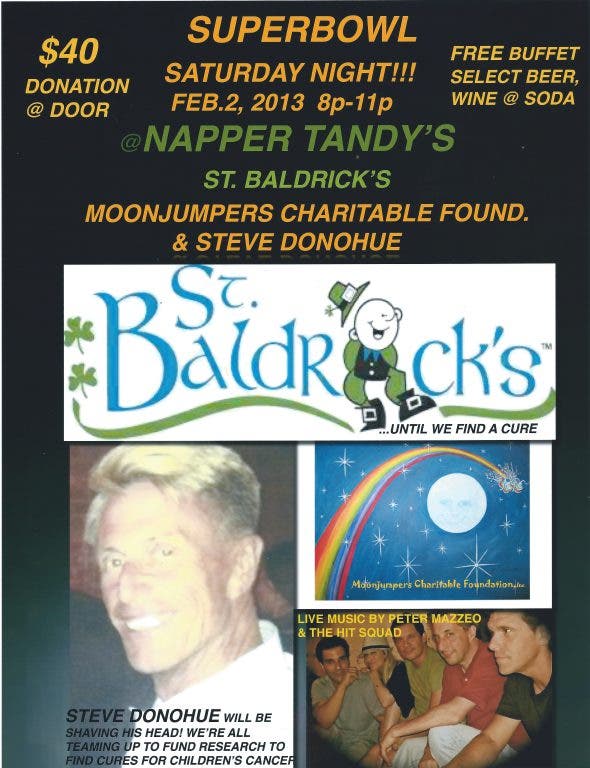 Moonjumpers Charitable Foundation is hosting a pre-Super Bowl party at Napper Tandy’s in Northport to benefit the St. Baldrick’s Foundation and its quest to find cures for childhood cancers on Saturday, February 2 from 8-11 p.m. It promises to be a really swinging evening.