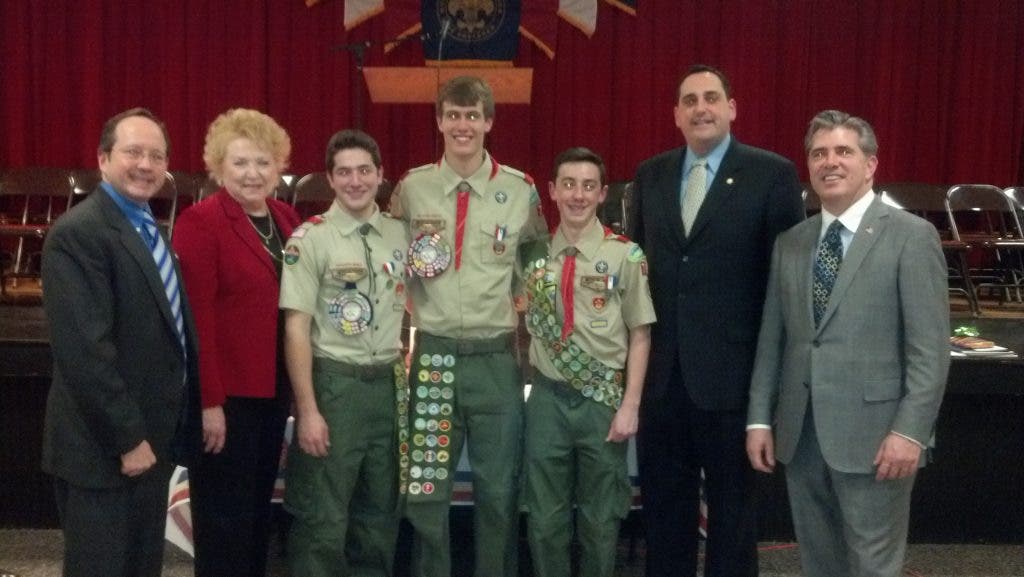 Assemblyman Chad Lupinacci (R,C,WF,I–Huntington Station) recently joined Huntington Town Councilman Mark Mayoka, Town Clerk JoAnne Raia and Town Councilman Eugene Cook to honor the three newest Eagle Scouts of Huntington Troop 78 during their Eagle Scout Court of Honor.