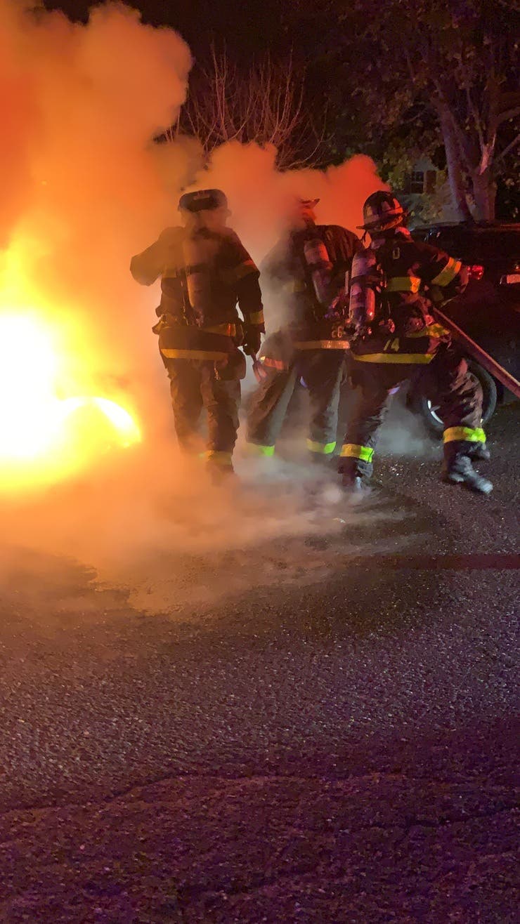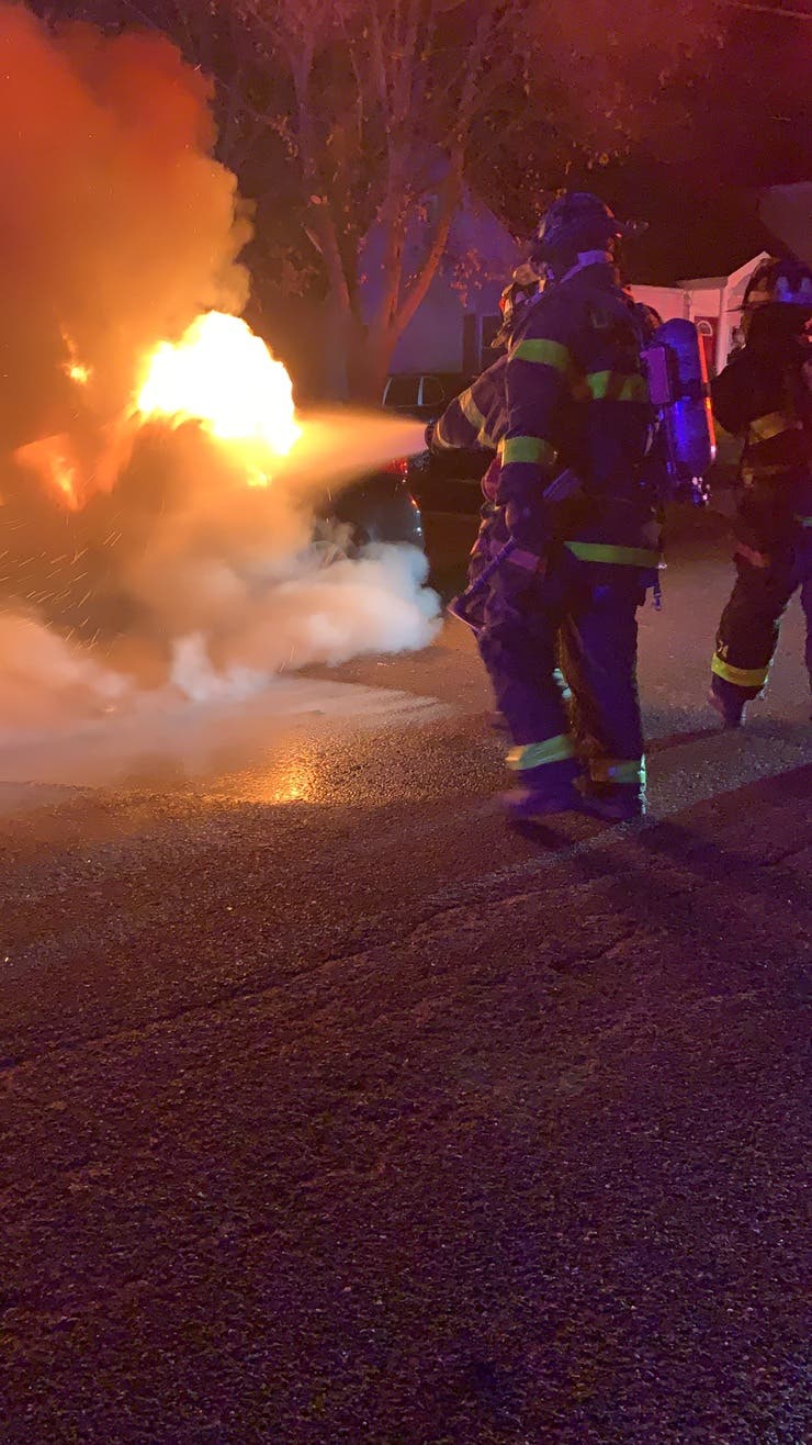 HUNTINGTON STATION, NY — A car burst into flames early Tuesday in Huntington Station. The Huntington Manor Fire Department headed to East 9th Street at 12:26 a.m. to battle the fully-involved car, according to P.I.O. Steve Silverman.
