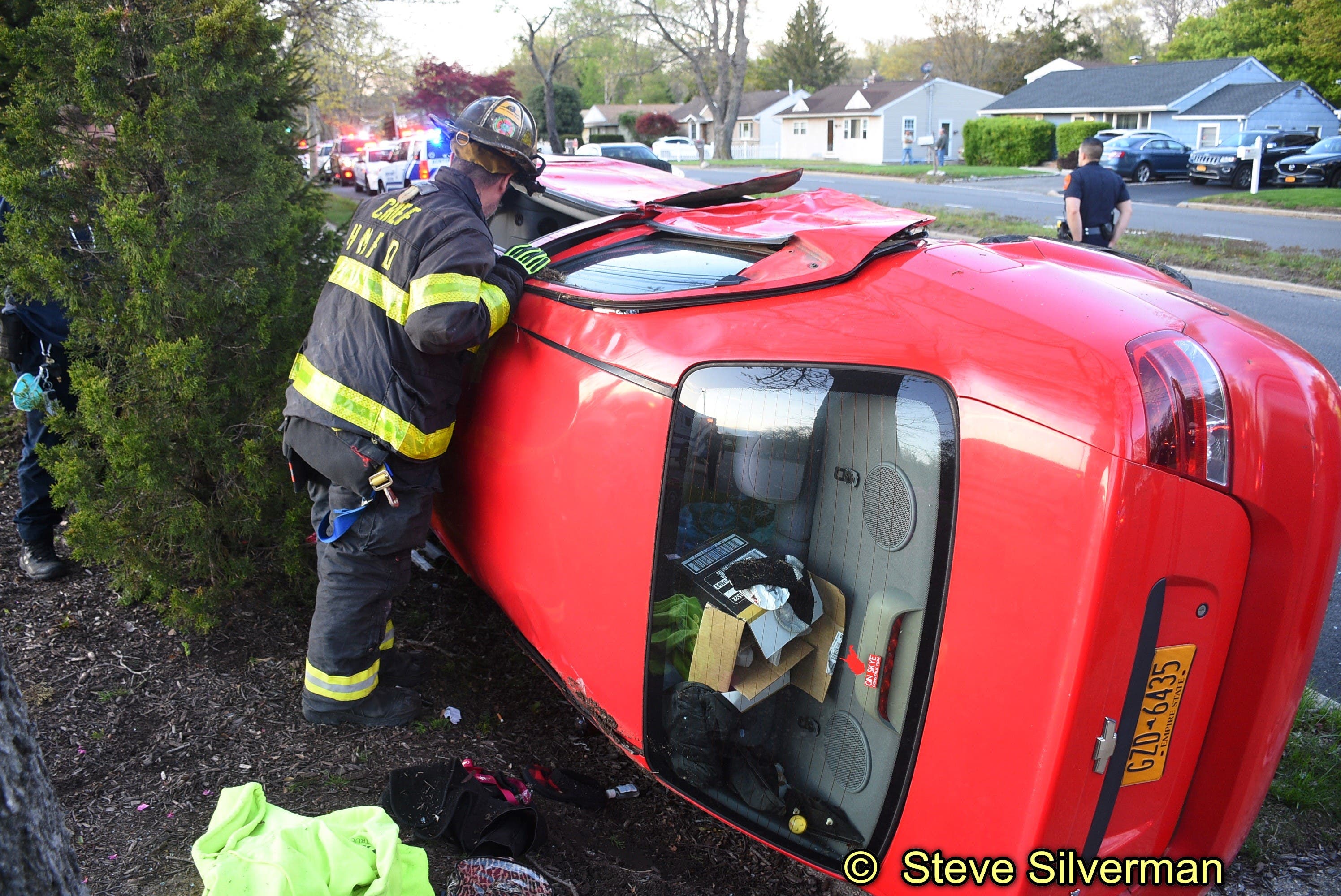 HUNTINGTON STATION, NY — A car overturned after a crash Saturday evening on New York Avenue behind Walt Whitman Shops in Huntington Station. The Huntington Manor Fire Department, Huntington Community First Aid Squad and Suffolk police responded to the crash around 7 p.m., said Steve Silverman, public information officer.