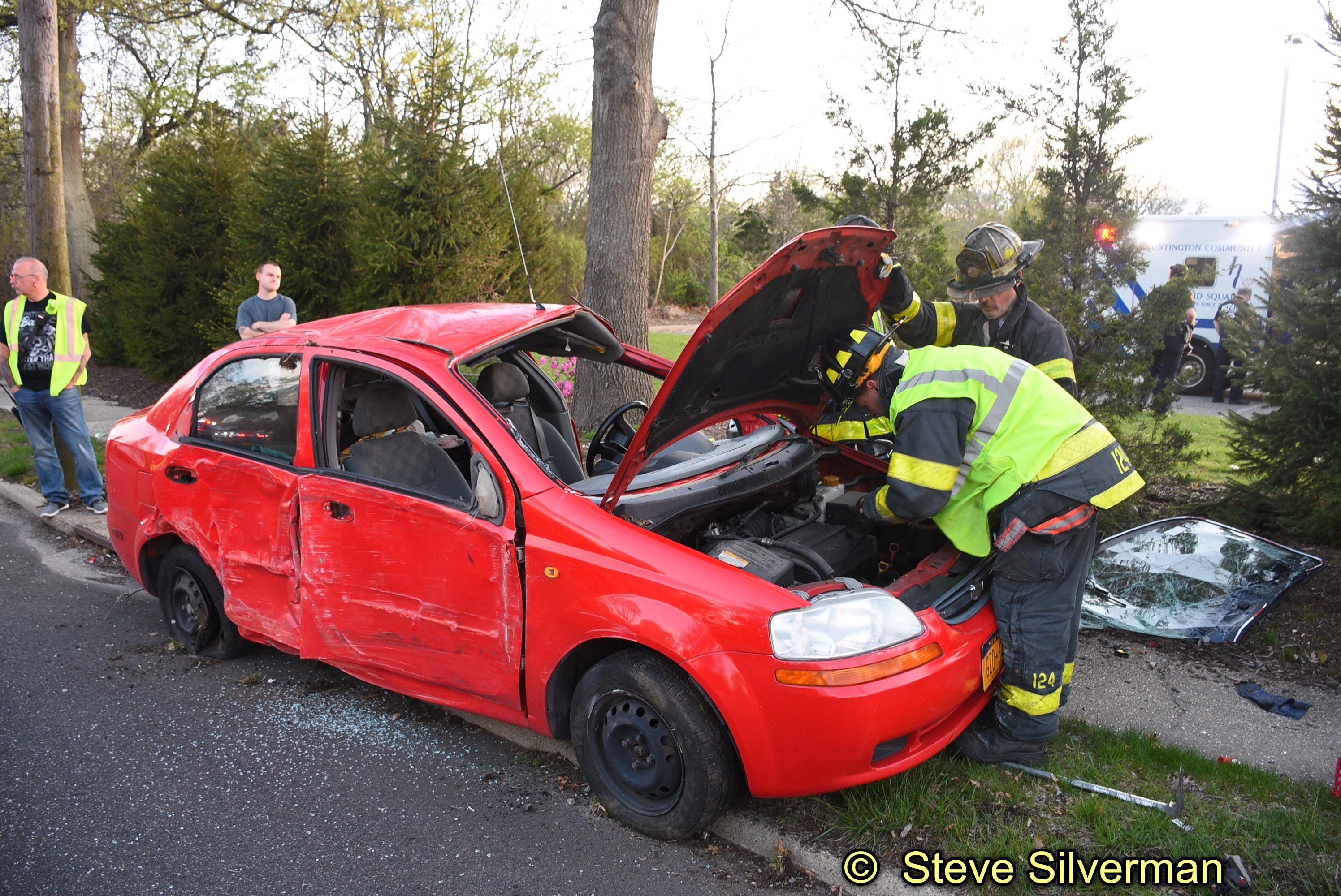 Under the direction of Chief Jon Hoffmann and assistant chiefs Chuck Brady and Jim Glidden, a heavy rescue truck was sent, and the crew secured the car. The driver suffered injuries that were non-life-threatening and was brought to Huntington Hospital.
