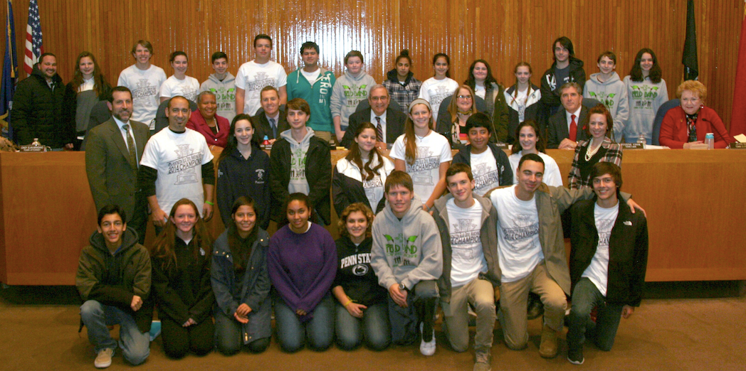 The Huntington High School Blue Devil Marching Band was honored at Town Hall for winning the New York State Field Band Conference Championship and Governor’s Cup.