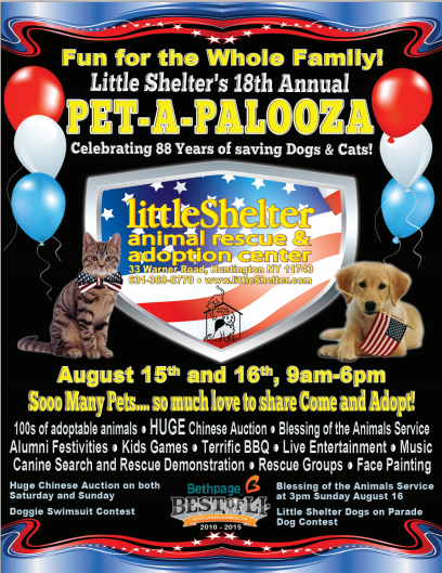 Stop by Little Shelter this weekend, August 15th and 16th and celebrate Pet-A-Palooza. Enjoy live entertainment, great food, demonstrations, a doggie swimsuit competition and much more! Bring the family and enjoy!