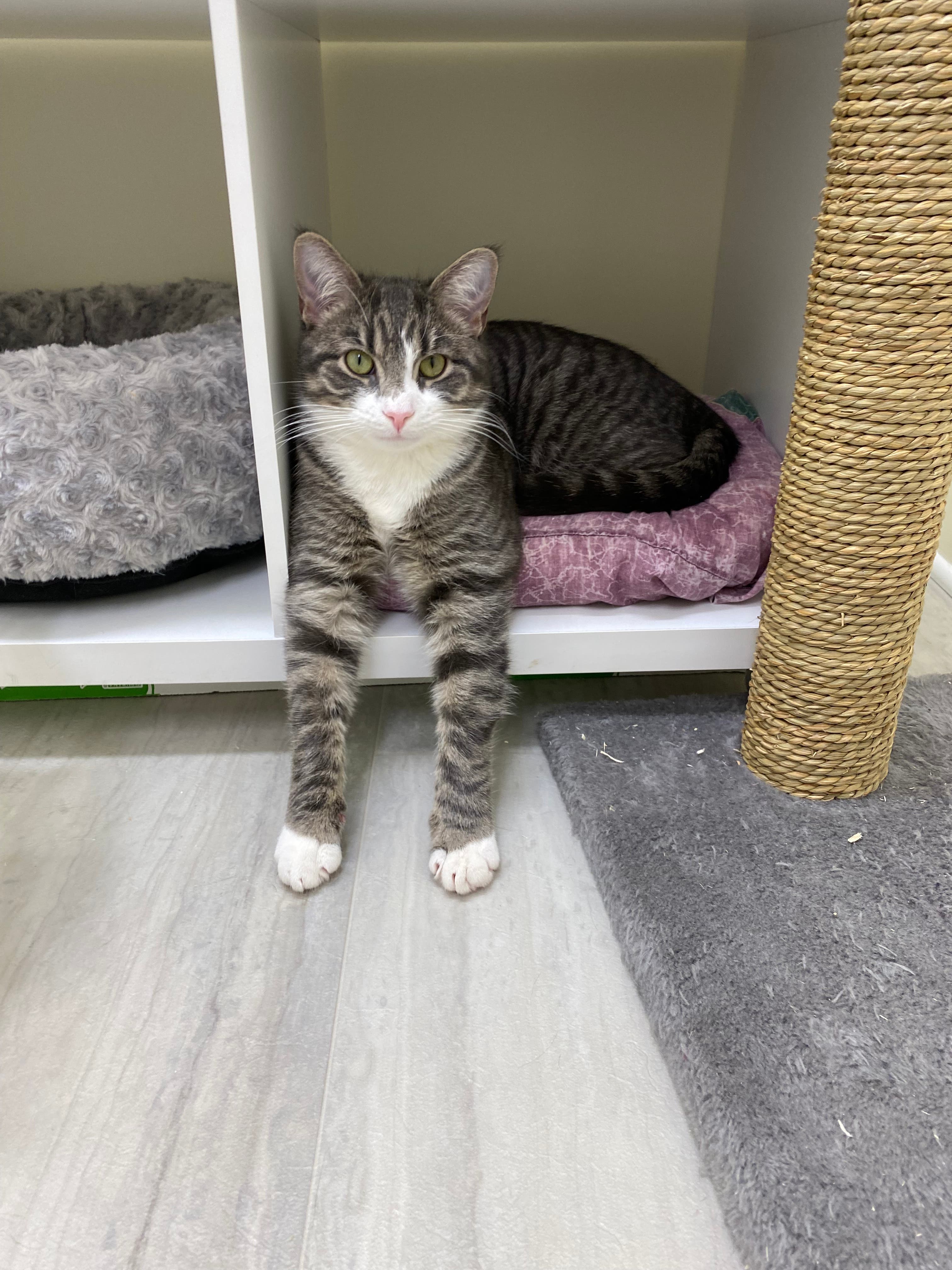 Bailey is a gray and white tiger cat. He is fully vetted, tested negative for FELV/FIV, litter box trained and neutered.