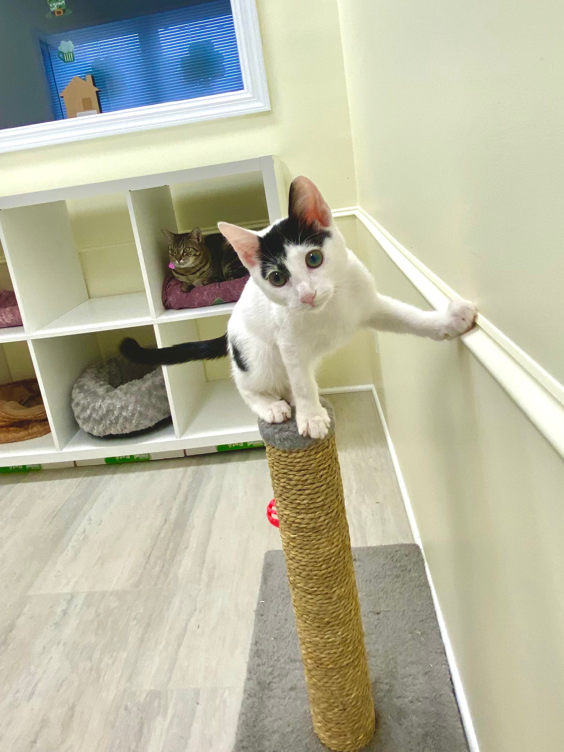 "She loves to talk and will let you know if she thinks you are not paying enough attention to her," she said. "She will check out every nook and cranny in the kitten room and empty the toy box numerous times per day. She tries to get her two roommates engaged with her antics but sometimes she just wears them out! She runs to the door to look out when someone is passing by, to let you know she is available for adoption. And if she thinks you have not noticed her, she will be practicing her acrobatics and swinging from the condos – just like the free swinging branches on a willow tree."