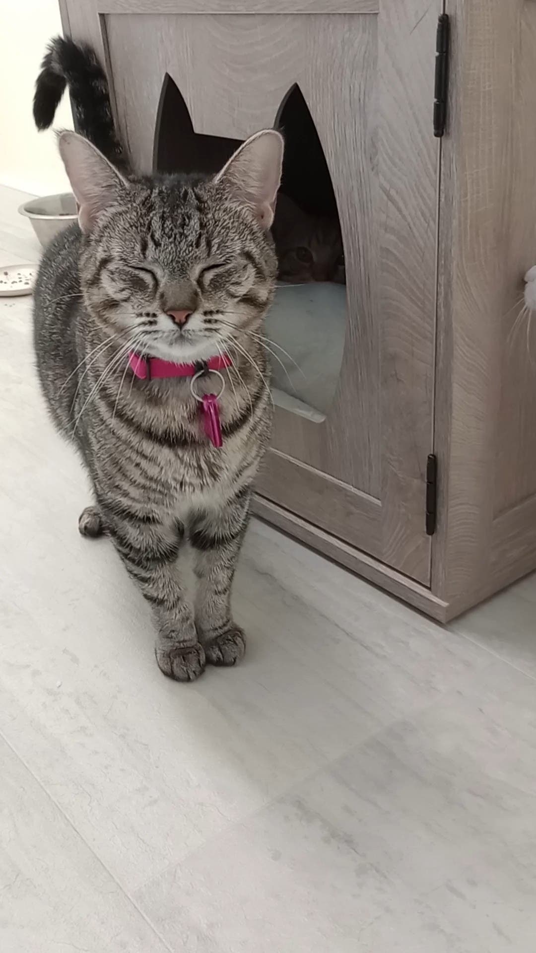 Penny is a gray tabby around 1 year old. Tabby cats are known for their distinct markings, including the stripes which are best for camouflage and the striking "M" on their foreheads like crowns.