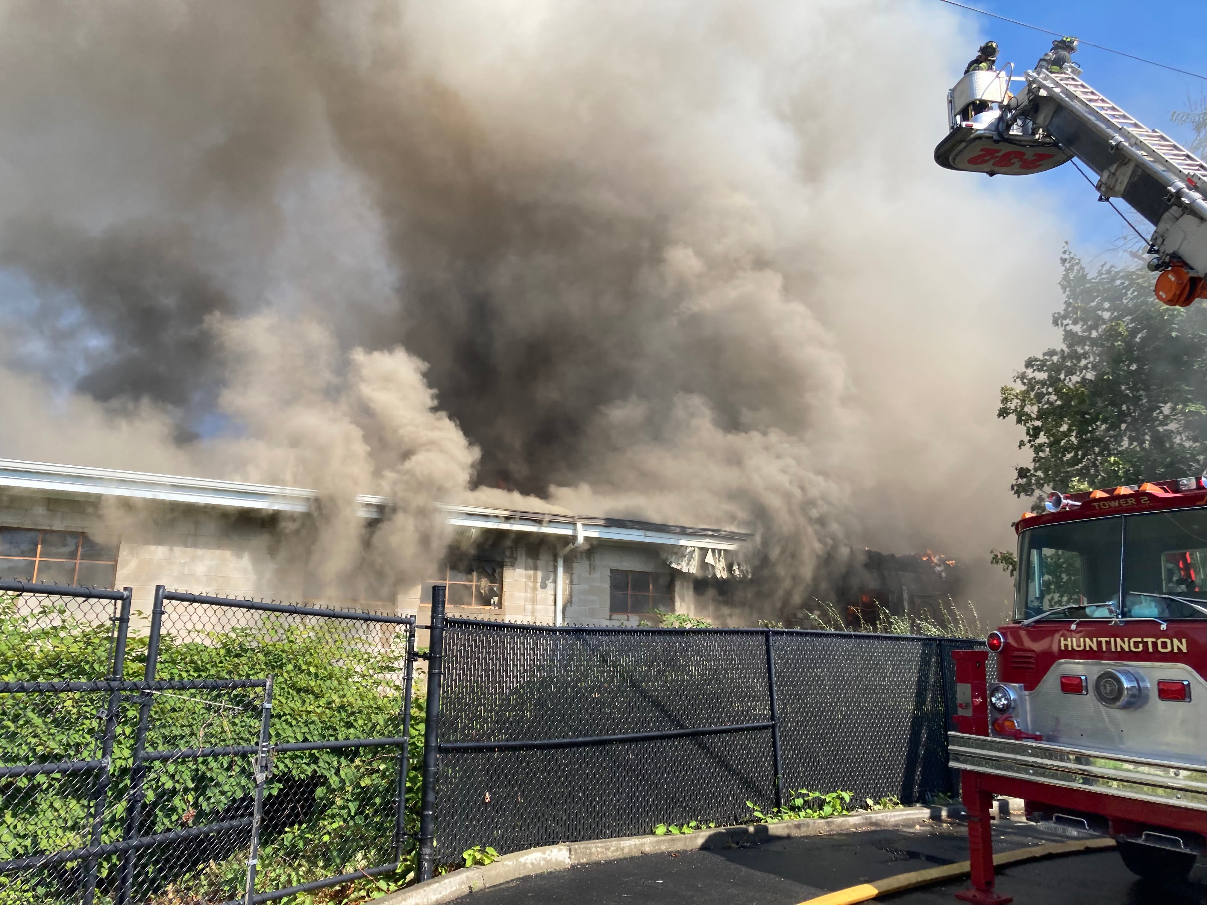 The first arriving fire engine aggressively attacked the flames outside the building, as multiple tower ladders and hose lines were operated by approximately 100 firefighters from Huntington, Halesite, Huntington Manor, Cold Spring Harbor, Greenlawn, Centerport, Northport, East Northport, Melville, Dix Hills, Eaton's Neck, and Syosset fire departments. The Huntington Community First Aid Squad provided help.