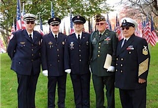 Photo: HCFAS Chief Tom Lemp (US Navy), Board of Directors Secretary Robert Franz ( US Army), Rich Rudolph (US Air Force), Paul Kelly (US Army), Richard Gierbolini (US Navy) stand in front of Field Of Honor on the lawn of Huntington Town Hall. Credit: Huntington Community First Aid Squad