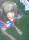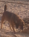 Snickers is mostly brown, weighs 30 pounds and is wearing a red collar.