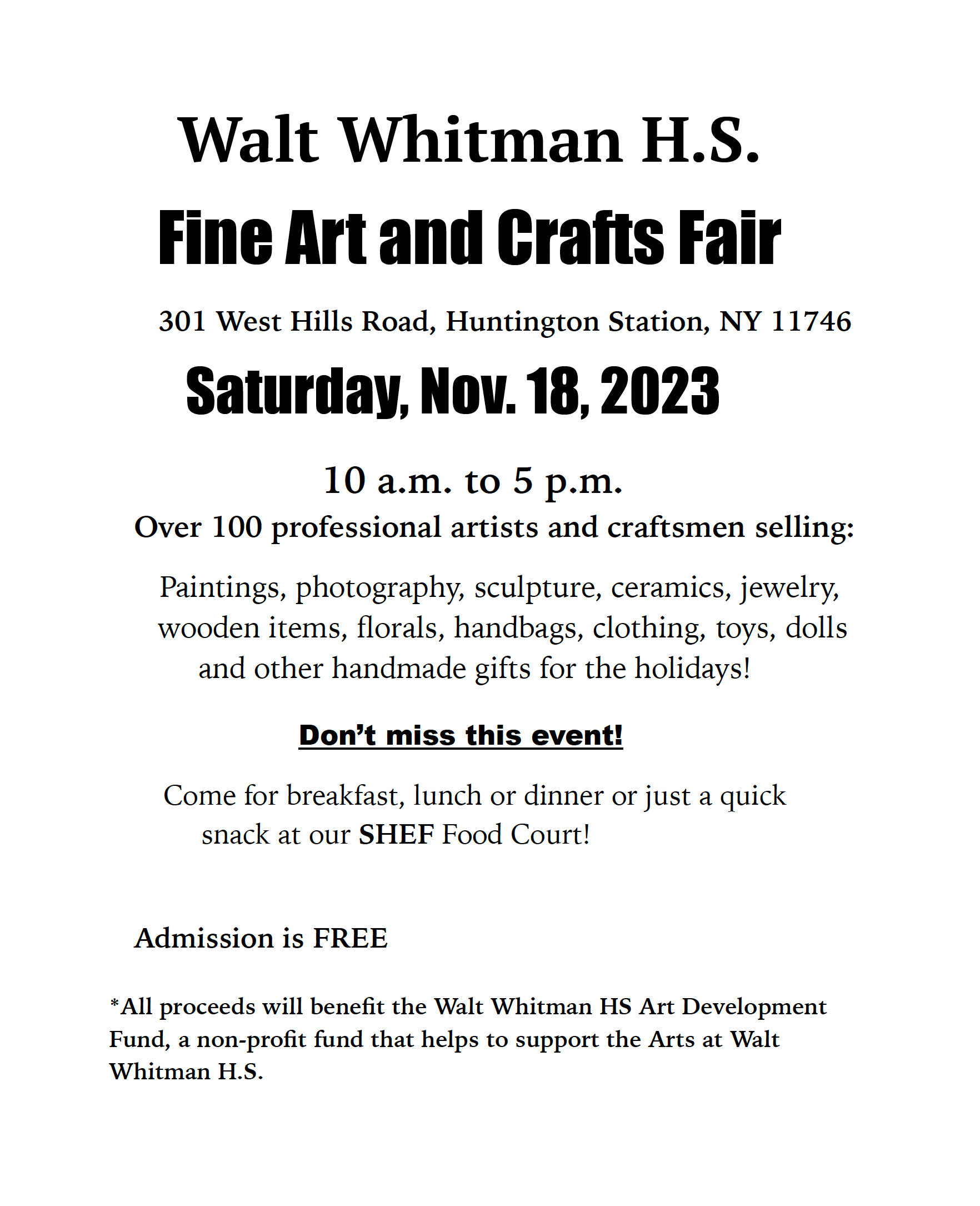 All proceeds from the fair will benefit the Art Development Fund, a non-profit fund that helps to support the arts at Walt Whitman High School and arts scholarships.