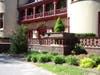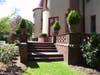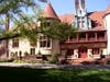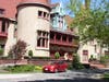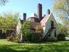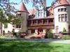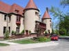 The chateau-style of the mansion's architectural elements include circular towers with cone-shaped roofs, a hipped roof on the main part of the mansion, elongated brick chimneys and steep, pointed masonry gables. The second-story porch over the entrance connects the two towers.