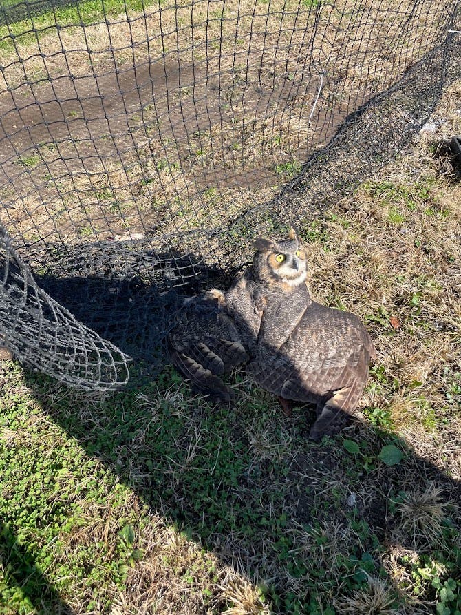 The owl had gotten his claws tangled in the net. Addeo covered part of the owl with a blanket while Faller untangled the claws. They slowly and carefully freed each leg one at a time. As they untangled the claws, they spoke to the owl in hopes of keeping him calm and building trust.