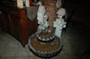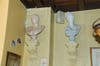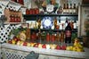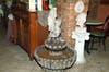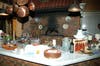 While shuttered windows overlook a pretend balcony, real trappings of glorious, sunny Tuscany include gurgling fountains, one complete with live koi, abundant statuary, and a profusion of flowers. In one corner of the main dining room, culinary accoutrements—fruit, jars of sauce, bottles of olive oil, and whimsical pottery, anchored by an old metal meat grinder—create a fanciful and colorful vignette.