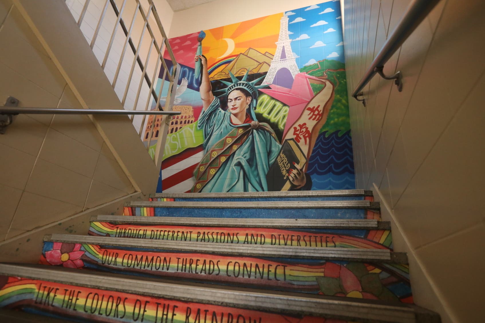 The mural can be found in the 300 wing stairwell by the high school’s Performing Arts Center and extends from the floor to ceiling.