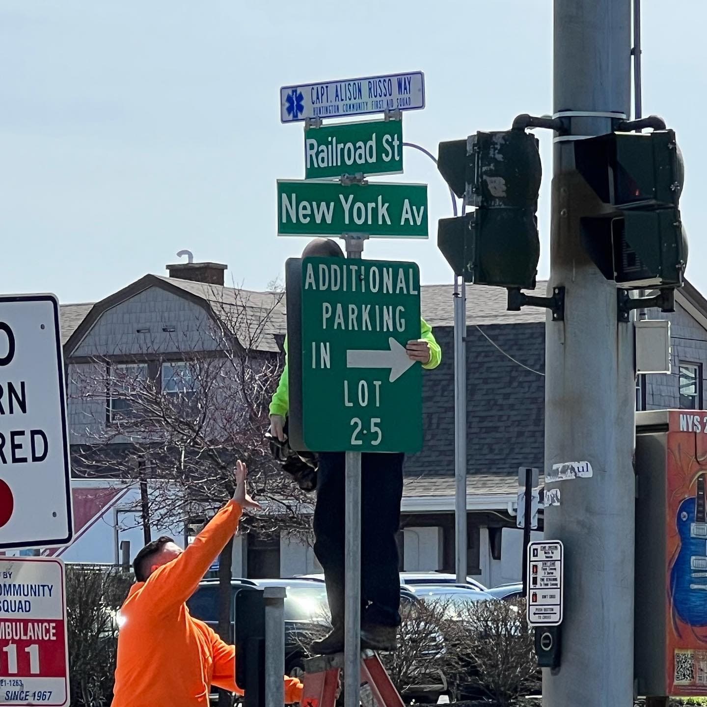 A stretch of Railroad Street was renamed for Russo, a slain FDNY EMT lieutenant and member of the Huntington Community First Aid Squad, on Wednesday. A sign bearing "Capt. Alison Russo Way" was placed.
