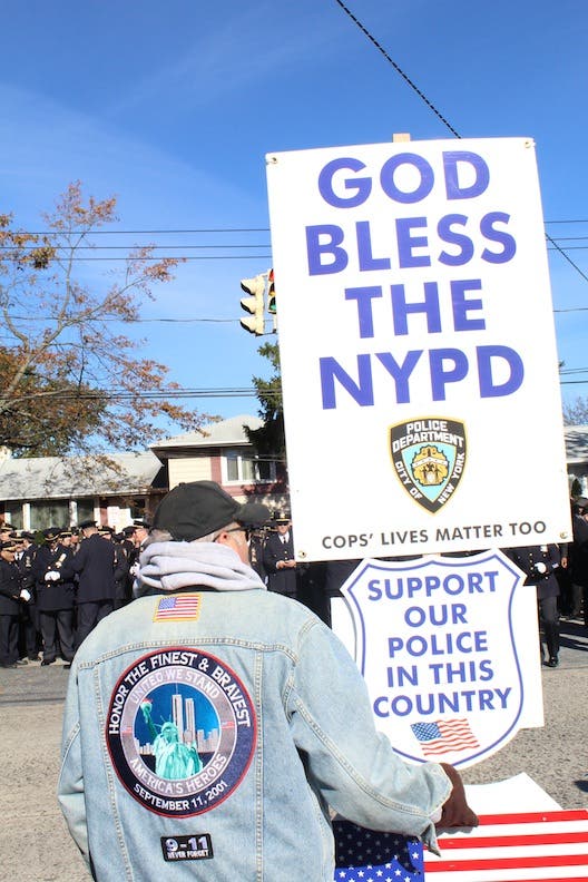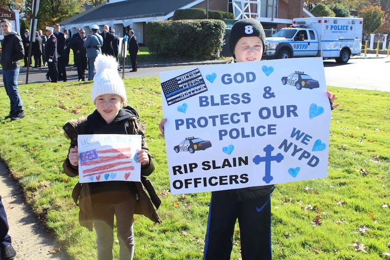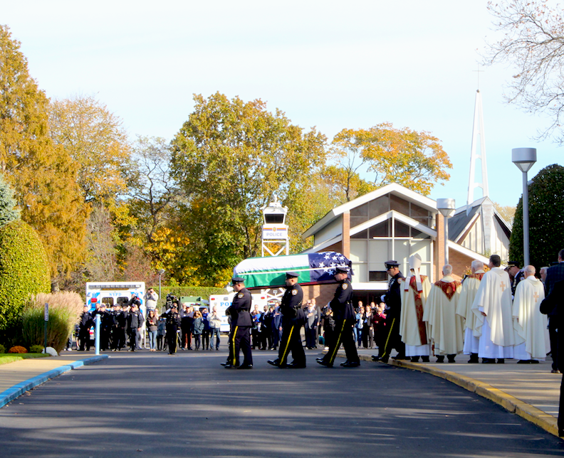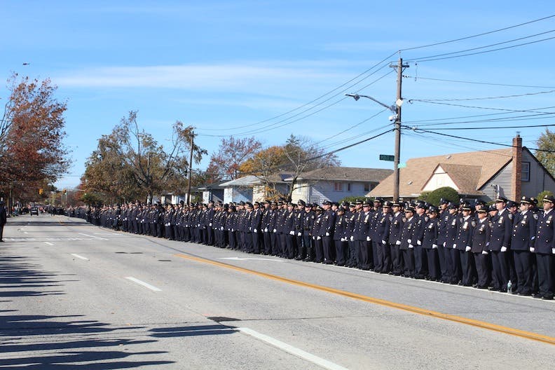Outside of the church, thousands of officers, including representatives from every police precinct in New York, stood at attention to pay their respects. They were lined up along Merrick Road for more than three-quarters of a mile, from Ocean Avenue to Park Boulevard.