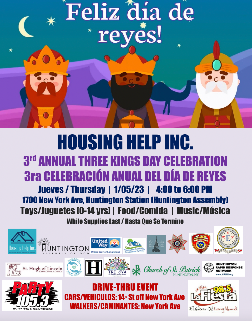 HUNTINGTON STATION, NY — The third annual Three Kings Day Celebration is scheduled for 4 to 6 p.m. Jan. 5, Housing Help Inc. announced.