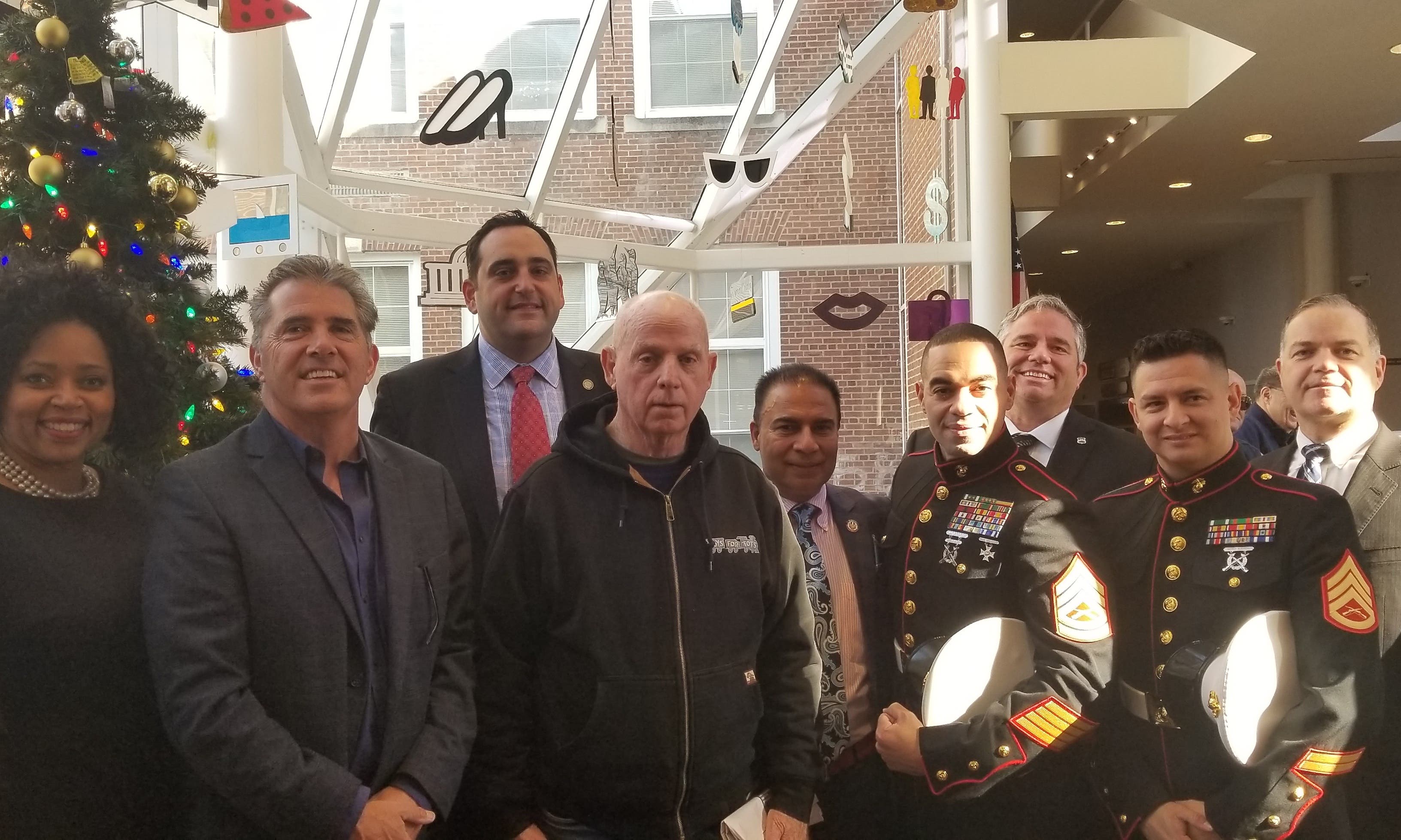 Supervisor Chad A. Lupinacci, Councilman Eugene Cook, Councilman Ed Smyth and Receiver of Taxes Jillian Guthman were joined by Major Chuck Kilbride, U.S. Marine Corps (USMC) (Retired), GySgt. John C. Sardine, USMC, Dr. Bobby Kalotee, co-chair, Long Island Toy for Tots Committee, and Robert Capodonna, Suffolk County Police Benevolent Association, to announce the Toys for Tots Campaign in the Town of Huntington Tuesday at Huntington Town Hall.