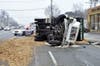 A landscaping truck overturned Wednesday morning after a collision with a car in Huntington Station.
