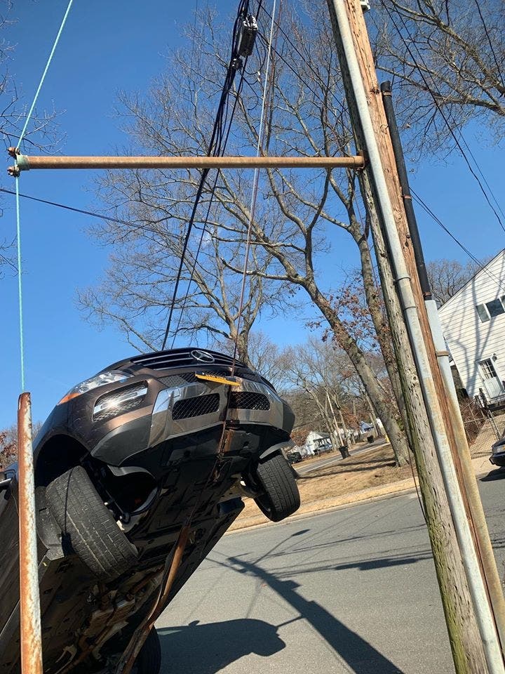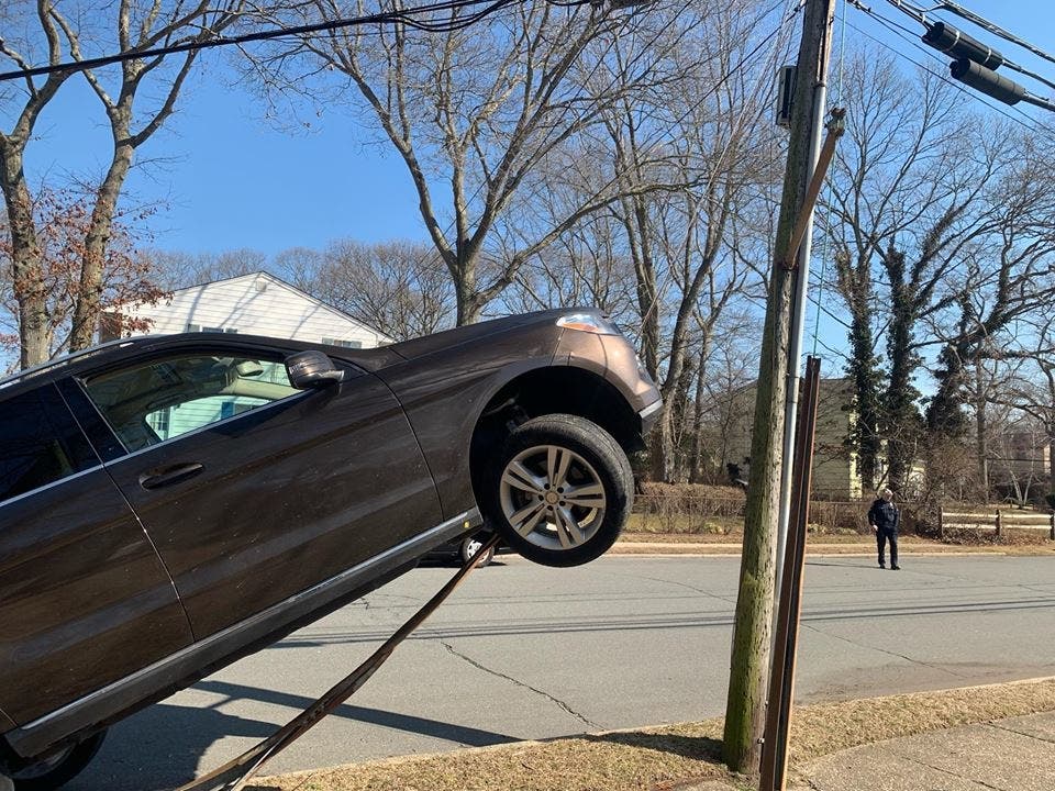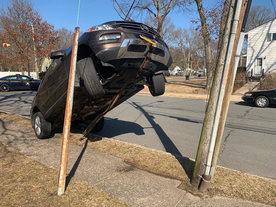 Suffolk Police, State Police and the Islip Fire Department responded after car crashed into a utility pole Monday afternoon.