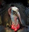 The male and female Turkeys are both very dark brown in overall appearance, embellished with lighter tan markings. Their feathers posses a beautiful sheen, which ranges from bronze, to green, blue and violet. They possess legs that are long, sturdy and largely bare of feathers. In the male of the species their legs have “spurs” on the backside. The necks and heads are also mostly devoid of feathers. The skin on the head of the male bird is red and blue, with the forehead of the bird being nearly white. During courtship these colors on the male turkeys head become even more vivid. A cone shaped fleshy protuberance called a “snood” hangs over the bird’s beak from the top. Male turkeys have a streamer (or “beard”) of bristle – like feathers that sprout from their chest.
