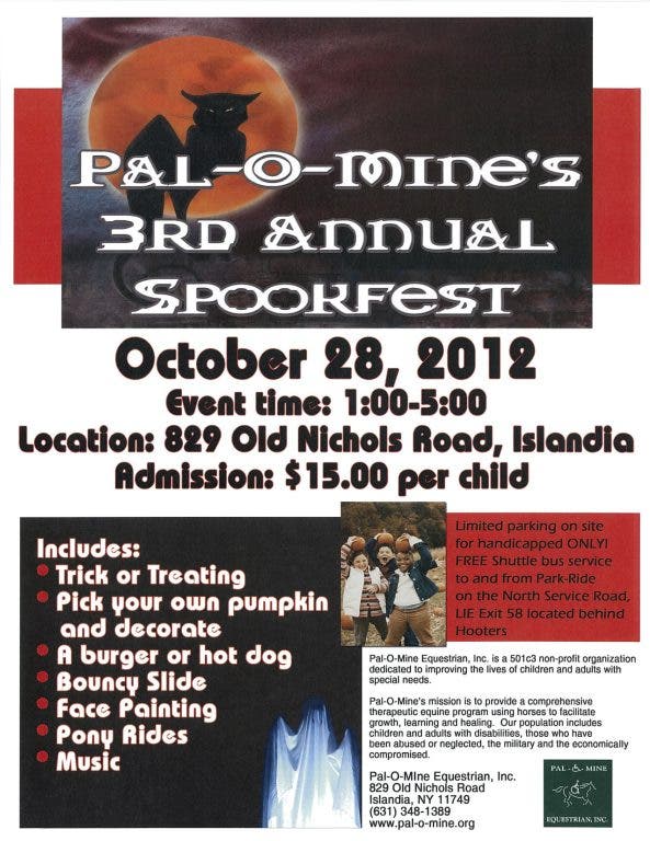 On Sunday, October 28, 2012, Pal-O-Mine Equestrian will host its 3rd annual Spookfest. The event, which takes place from 1-5pm, is open to the public and is designed for families and children of all ages. The Spookfest will be held at Pal-O-Mine Equestrian located at 829 Old Nichols Road, Islandia, NY.