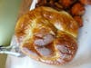 What's Inside: Grilled chicken cutlet with cheddar cheese, crisp bacon and tobacco onion rings topped with homemade BBQ sauce. All of this is sandwiched between a fluffy and toasted pretzel roll.