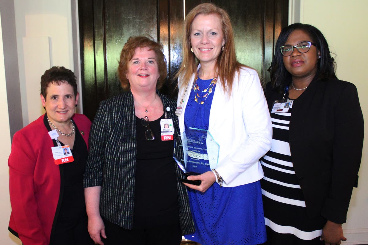 Pictured from left: Valerie Terzano MSN, RN, NEA-BC, Chair of the Nurse Excellence Sub-Committee and Senior Vice President of Nursing/Chief Nursing Officer, Winthrop-University Hospital; Mary Jane Finnegan MSN, Chief Nursing Officer, St. Catherine of Siena Medical Center; 2017 Nurse of Excellence Lisa Koshansky RN; Keisha Wisdom MA, RN, Vice President and Chief Nursing Officer, Brookhaven Memorial Hospital Medical Center