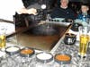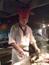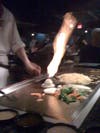 Our chef, Bill, arrives in whites and red chef hat and begins the show: spatula twirling, balancing and flipping eggs in the air and into his hat. Next, the signature move and ice-breaker, in homage of Mount Fuji, an active volcano: circles of onions are shaped into a pyramid, filled with vegetable oil and lighted, making a two-foot flame, causing gasps and instant bonding.