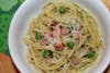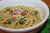 Meanwhile, cook the pasta according to directions, until al dente. Reserve about 1 cup of the pasta-cooking water, then drain the pasta and return it to the pot. Over moderate heat toss the pasta with the pea pesto, reserved cooking water, reserved peas, Canadian bacon, and the mascarpone cheese. Cook for about 1 minute, and season with salt & pepper, to taste. Serve immediately, garnished with remaining grated cheese.