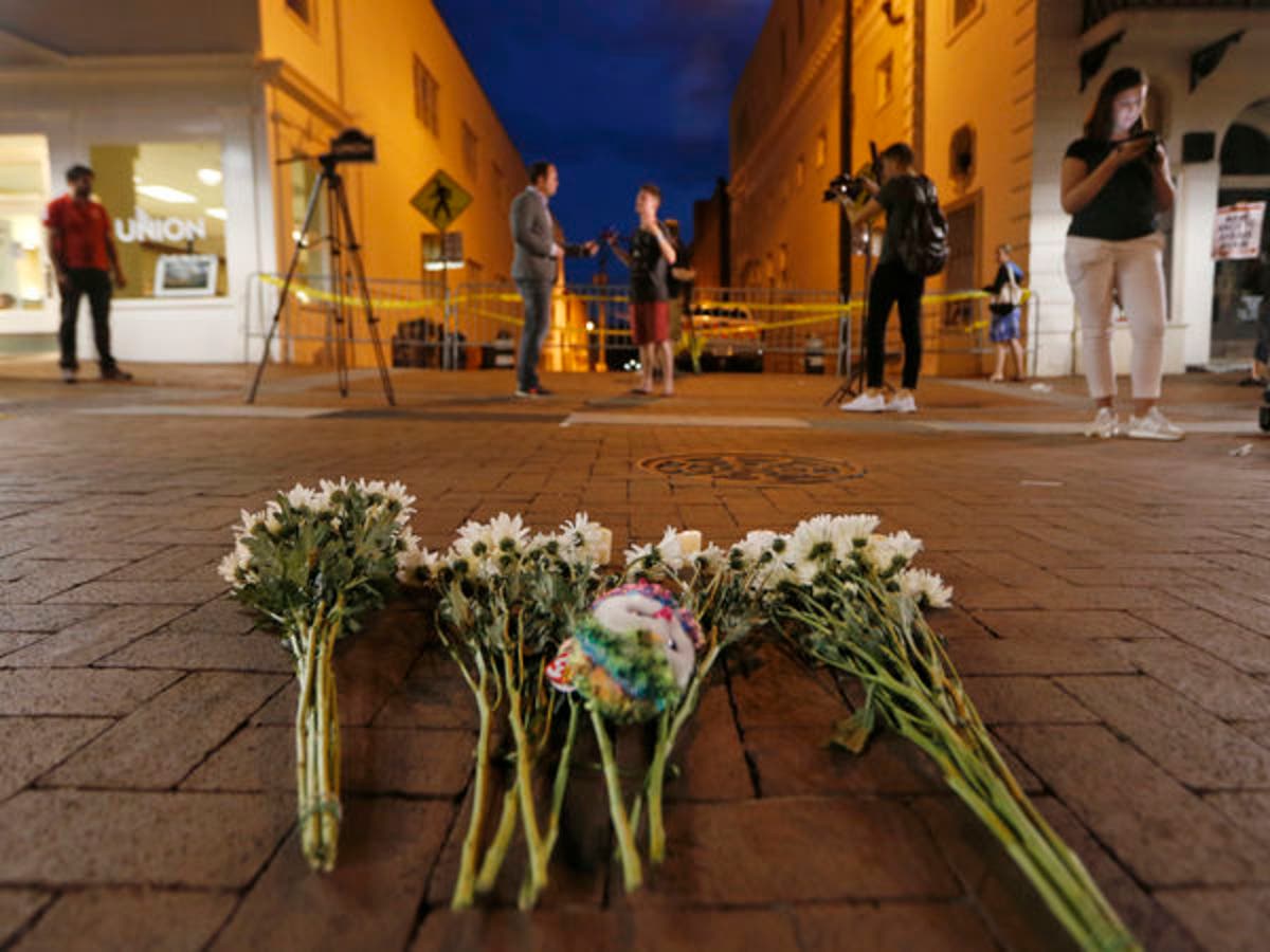 Photo: Flowers and other mementos are left at a makeshift memorial for the victims after a car plowed into a crowd of people peacefully protesting a white nationalist rally earlier in the day in Charlottesville, Virginia, Saturday, Aug. 12, 2017. Photo by Steve Helber/Associated Press.