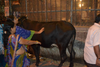 I lingered a bit on my way out, stopping for my prayer band and anointment. I looked at some garlands of various religious symbols (I assume) but took a pass, choosing not to haggle on the price – an Indian art form at which I have started to become quite adept. I also noticed several “Nazi” swastikas, including a blinking neon light config. I know enough about Hitler-era Germany to know that this icon attributed to the 20-century’s original evil empire actually had its roots in Eastern religion. For Hindis, the swastika is most commonly used as a charm to bring good luck and fortune. Exiting the shrine I came upon my first holy cow – literally. It stood patiently alongside a vendor who was maybe a human relative. Who knows? I say this in all due respect as Western religions have a lot of their own comparatively strange beliefs and practices. Believers stopped reverently to touch the animal or give it fingertip kisses. Probably inappropriately, I chose to just snap a photo.